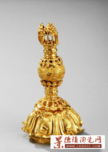 揚(yáng)州博物館收藏的清·金帽頂,是當(dāng)年在邗江甘泉公社長塘大隊(duì)高莊生產(chǎn)隊(duì)出土的,這件帽頂用純金鏨刻,通高9.5厘米,呈寶塔形狀,從下至上由四部分組成,由一根中軸相串連,每部分均可轉(zhuǎn)動(dòng),下層為六瓣蓮花座,第二層形似花傘,第三層為一鏨花球體,頂端有九根花柱;斨蹟嘁桓。