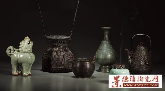 悠然自得•茶器花器香器專場為新增拍場,拍品50余件。包含瓷器、紫砂、竹器、木器、銅器等材質(zhì)。茶器中清•紫砂小茶壺一對小巧精致,估價在0.3萬-0.5萬元;ㄆ髦兄窬幓ㄆ鳛槭状瓮瞥,均為二十世紀(jì)制作,兼具實用與觀賞價值,估價均在人民幣0.5萬元以內(nèi);清•粉彩荷葉紋花盆成套出現(xiàn),估價在2.5萬-3萬元。香器中香爐、香薰眾多,以元、明時期浙江龍泉窯為主。