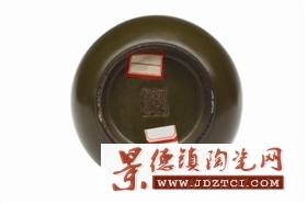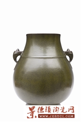 茶葉末瓷器的生產(chǎn)始于唐代,如在陜西耀州窯遺址中出土了茶葉末釉瓷器,釉色有黃綠、褐綠等。唐以后,有些窯廠也有茶葉末釉瓷器,但這類茶葉末釉瓷器,可能是在燒制青釉或黑釉瓷時,由于胎釉原料及燒成時產(chǎn)生的變化,而出現(xiàn)茶葉末釉色。清代雍正、乾隆時期,景德鎮(zhèn)御窯廠在繼承古代優(yōu)良傳統(tǒng)的基礎(chǔ)上將其應(yīng)用于白瓷胎上,精工細作,燒制出富于變化的多種色澤的茶葉末釉瓷器。據(jù)唐英的《陶成紀(jì)事》記載:“仿廠官窯,有鱔魚黃、蛇皮綠、黃斑點三種。”黃斑點即為“茶葉末”。從傳世品看,雍正時是有茶無末,乾隆時是茶末兼有。如鎮(zhèn)江博物館藏乾隆款茶葉末釉綬帶葫蘆瓶,高26.2厘米,口徑2.8厘米,底徑8.2厘米;呈葫蘆形,小口、細直頸,兩側(cè)為對稱的彎曲綬帶形系耳,俊秀飄逸,中間為束腰式箍形裝飾。瓶底足外撇,圈足露胎,胎體較薄,底部刻有“大清乾隆年制”六字三行方圖章篆款。全器施茶葉末釉,釉色純正,色調(diào)沉穩(wěn),綠中閃黃,黃中閃綠,圈足釉色較深,足部釉與露胎相接處有刮削時無意留下的一圈小鋸齒痕,造型優(yōu)美,線條流暢,制作精細。茶葉末釉獸耳尊,高45厘米,口徑21厘米,底徑22.3厘米;口微斂,兩側(cè)為對稱的獸形系耳,下腹垂大,圈足;圈足內(nèi)有“大清乾隆年制”六字三行方圖章篆款。全器施茶葉末釉,色澤深沉,典雅古樸。此器為仿古銅器,具有青銅器的沉著穩(wěn)定的色調(diào)。