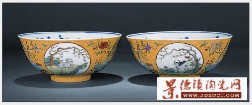 圖中這套對碗為清光緒官窯器中的精品,口徑15厘米,斜弧腹下收,圈足。內(nèi)壁及底施白釉,瑩亮光潤,碗心青花雙圈內(nèi)繪三只羊在樹下休息,寓意“三羊開泰”,青花圈外飾折枝花卉及石榴、魚、如意等吉祥圖案。外壁以黃釉軋道為地,上飾雜花瓶、石榴、如意等雜寶紋,留三個圓形開光,其內(nèi)分別繪三只羊,或站或臥,姿態(tài)各異,與碗心三羊相呼應(yīng)。軋道,又叫雕地,宮中稱錦上添花,景德鎮(zhèn)藝人謂耙花,它先在白胎上均勻施一層色料,如紅、黃、紫、胭脂紅等,再在色料上用一種狀如繡花針的工具拔劃出細(xì)的鳳尾紋,最后配以花鳥、山水等圖飾或開光圖飾。而粉彩軋道工藝就是把粉彩和軋道兩種工藝有機(jī)結(jié)合,形成珠聯(lián)璧合的驚艷效果。