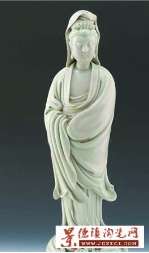 上海博物館收藏的明德化窯白釉“何朝宗”款觀音像(如上圖所示),高48厘米。觀音頭挽高髻,披帔巾,面部豐滿圓潤,目光向下,表情柔和,體態(tài)豐腴,頸戴項圈,上著袒胸廣袖褒衣,下著寬腿長褲,兩手相拱互置袖中,赤足,立于水波蓮花上。衣褶線條柔潤,頭發(fā)絲絲畢現(xiàn),刻畫精細,含蓄端莊,溫順靜雅,栩栩如生。背面隱隱約約鐫刻有“何朝宗印”。
