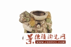 筆者早先就注意到館藏的這件武士牽獅俑,看其形制似乎是一個(gè)器座,但一直不很清楚它的具體用途。上個(gè)月在北京參加全國博物館專業(yè)人員陶瓷鑒定培訓(xùn)班,偶然聽到北京大學(xué)秦大樹教授授課中提到一件同類的金代紅綠彩塑像。培訓(xùn)回來后,筆者立刻查找相關(guān)資料,并很快在1997年第10期的《文物》期刊上找到秦大樹先生《邯鄲市峰峰礦區(qū)出土的兩批紅綠彩瓷器》一文。文中介紹1972年峰峰礦區(qū)發(fā)現(xiàn)的一處窖藏,出土了一批紅綠彩佛像,其中一件菩薩騎獅塑像高46.2厘米,獅子高20.5厘米、長22.5厘米,獅子側(cè)面亦塑有一牽獅武士,造型、尺寸及風(fēng)格幾乎與安徽博物院收藏的這件武士牽獅俑完全相同。于是,筆者豁然明了,獅背上圓形器上方原來應(yīng)有一尊菩薩塑像,獅子是這位菩薩的坐騎。