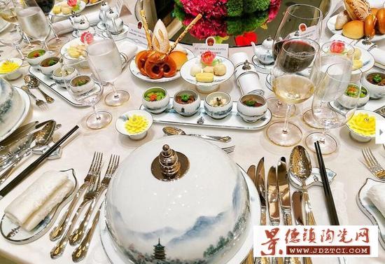 9月4日,G20杭州峰會(huì)于下午3時(shí)開幕,當(dāng)晚,與會(huì)嘉賓在杭州西子賓館參加了歡迎晚宴。晚宴的餐具成為亮點(diǎn),取自西湖景致的山水畫被描繪于杯盤之上,杭州西湖的標(biāo)志性景點(diǎn)“三潭印月”也被搬上餐桌。也因其古樸,這套餐具被網(wǎng)友戲稱為乾隆的審美。