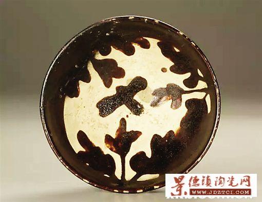 碗口徑11.2厘米,足徑4.9厘米,高4.3厘米,1973年耀州窯遺址出土,現(xiàn)藏于耀州窯博物館。器內(nèi)滿飾化妝土,器外飾化妝土至脛部,器外脛部以上施黑釉過口沿,內(nèi)壁及底用黑釉彩繪花葉紋,釉色黑中泛醬紅,極富裝飾趣味性。