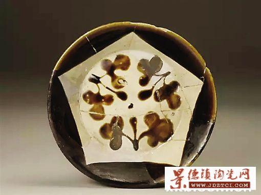 耀州窯素地彩裝飾紋案的題材十分豐富,但以花卉內(nèi)容最為常見。主要裝飾在碗、盤類器物的內(nèi)底。其典型構(gòu)圖形式為:在黑色連弧環(huán)繞的白地中心,繪一朵或數(shù)朵花卉,寫意或具象,風(fēng)格多樣.