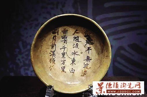 碟高4.2厘米,口徑14.7厘米,底徑5厘米,1978年長沙窯廖家坡遺址出土,現(xiàn)收藏于長沙市博物館。器物圓唇,敞口,折腹,圈足。碟心無釉, 以褐彩在碟心書寫:“鳥飛平無近遠(yuǎn),人隨流水東西。白云千里萬里,明月前溪后溪。”這是唐代詩人劉長卿題為《苕溪梁耿別后見寄》詩中八句的其中四句,全詩通過描寫飛鳥、流水、白云、明月等景物,以“遠(yuǎn)近”“東西”“千萬”“前后”等對仗表露出作者遠(yuǎn)離鄉(xiāng)土、懷才不遇的惆悵之情。