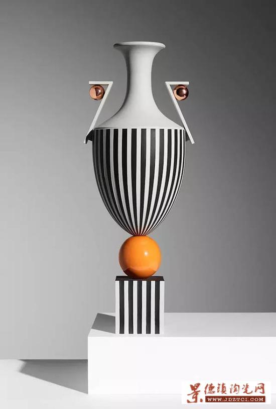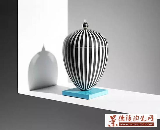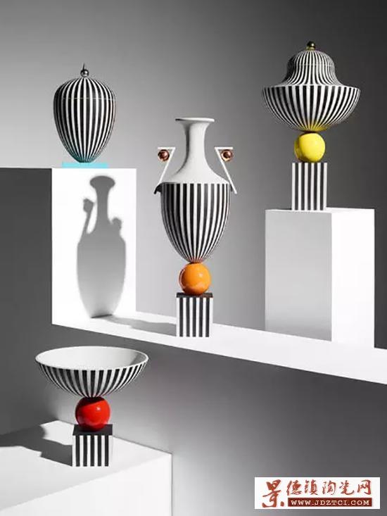 Broom 在研究了各個時期的 Jasperware 花瓶輪廓之后,決定沿用它的輪廓。但他并沒有使用經(jīng)典的淡藍(lán)色,而是給 Jasperware 刷了黑白相間的條紋,并且上了一層光亮的釉色。