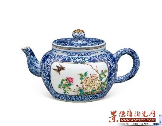清乾隆粉彩青花開(kāi)光花鳥(niǎo)紋描金茶壺