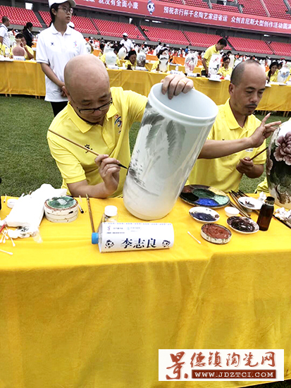當天下午,“千名陶藝家迎省運眾創(chuàng)吉尼斯榮譽大型創(chuàng)作活動”在江西省第十五屆運動會主場館景德鎮(zhèn)市體育中心體育場內上演。綠茵場上,李志良先生與其他陶藝家分散排開,在白胎瓷瓶上揮毫創(chuàng)作,以童子為等題材,盡情展現(xiàn)千年瓷都藝術風采。