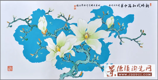 周?chē)?guó)生尋求通過(guò)花鳥(niǎo)瓷畫(huà)作品來(lái)挖掘與傳達(dá)更為豐富而深刻的中國(guó)民族文化思想、偉大而先進(jìn)的新時(shí)期中國(guó)主旋律思想,并希圖將二者融合,這也正是瓷畫(huà)系列作品《夢(mèng)》系列白玉蘭花創(chuàng)作的本質(zhì)和靈魂。社會(huì)和諧是《夢(mèng)》系列作品表達(dá)的核心理念之一,在瓷畫(huà)系列作品《夢(mèng)》中,白玉蘭花相互依伴,相互呼應(yīng),團(tuán)結(jié)在一起,正象征著全國(guó)人民同氣連枝,團(tuán)結(jié)一心,友好共處;作品中白玉蘭花順枝而生,禮讓不爭(zhēng),井然有序,正體現(xiàn)的是一種穩(wěn)定有序的社會(huì)秩序;玉蘭花蓬勃向上,呈現(xiàn)出蓬勃旺盛生命活力,象征著我們偉大祖國(guó)富有朝氣,充滿生機(jī)。