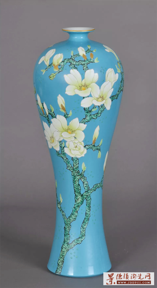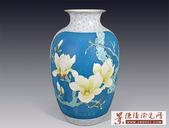 作為非物質(zhì)文化遺產(chǎn)“景德鎮(zhèn)傳統(tǒng)粉彩制作技藝—粉彩花鳥(niǎo)繪制”傳承人的周?chē)?guó)生最開(kāi)始采用的是粉彩工藝來(lái)表現(xiàn)玉蘭花,用低溫湖藍(lán)釉為底色,以本金描繪花托。后感到僅用粉彩工藝來(lái)表現(xiàn)花朵和枝葉尚顯不足,清麗柔美之中缺乏厚重感,于是周?chē)?guó)生采用古彩工藝來(lái)表現(xiàn)樹(shù)枝及葉片,遒勁深沉的古彩黑色線條使枝葉更為突出厚重,與采用粉彩表現(xiàn)的清秀潔白的玉蘭花朵產(chǎn)生強(qiáng)烈的對(duì)比。還采用古彩的翡翠顏料在藍(lán)釉地上進(jìn)行點(diǎn)綴裝飾,既打破了藍(lán)釉底的單調(diào),又豐富了畫(huà)面構(gòu)圖和寓意。用本金描繪花托,還創(chuàng)造性地采用本金來(lái)描繪玲瓏石。《夢(mèng)》系列玉蘭花瓷畫(huà)作品采用了粉彩、古彩、金彩和顏色釉等多種工藝材料,工藝難度較高!秹(mèng)》系列白玉蘭瓷畫(huà)作品至少需要三次燒成:先是入窯經(jīng)1200攝氏度以上的高溫?zé)伤卮砂滋ィ缓笫侨霠t以700~800攝氏度低溫二次燒成藍(lán)色底色,再是入爐以800攝氏度左右低溫三次燒成粉彩、古彩、金彩等釉上彩料描繪的畫(huà)面。如釉上彩料燒成沒(méi)有達(dá)到預(yù)期的畫(huà)面效果,還需要進(jìn)行第四次甚至第五次燒成。因選用多種不同的工藝裝飾材料增加了作品的燒成難度。