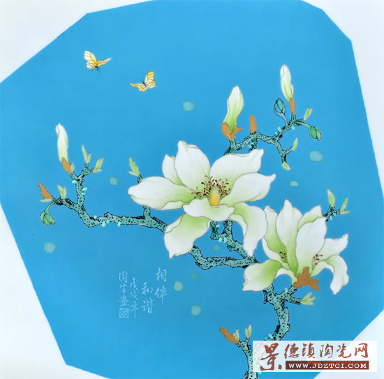 當(dāng)代粉彩花鳥(niǎo)瓷畫(huà)繼承了傳統(tǒng)粉彩花鳥(niǎo)瓷畫(huà)疏密二體并存的構(gòu)圖方式。周?chē)?guó)生則以疏體構(gòu)圖作為主要構(gòu)圖方式。大面積藍(lán)釉為底,繪一枝白玉蘭、數(shù)只蝴蝶,構(gòu)圖簡(jiǎn)潔而明快。簡(jiǎn)潔疏朗的構(gòu)圖方式襯托出玉蘭花的高潔典雅,也符合當(dāng)代審美趨于簡(jiǎn)潔的趨勢(shì)。與簡(jiǎn)潔構(gòu)圖相對(duì)應(yīng)的,周?chē)?guó)生決定選擇更為單純的色彩表現(xiàn)。玉蘭花瓣的無(wú)瑕白色、花蕊的黃色、背景的悅目藍(lán)色、枝干的遒勁黑色、花托與石頭的純正金色……每一種色彩的運(yùn)用都力求干凈清澈。采取多種單純色彩相配合的方式是一種相對(duì)冒險(xiǎn)的方式,假如色彩搭配不當(dāng),即有可能整體色彩出現(xiàn)失衡。周?chē)?guó)生不斷的摸索,逐漸熟悉了這種用色方式,在單純中追求層次感、縱深感與協(xié)調(diào)感。