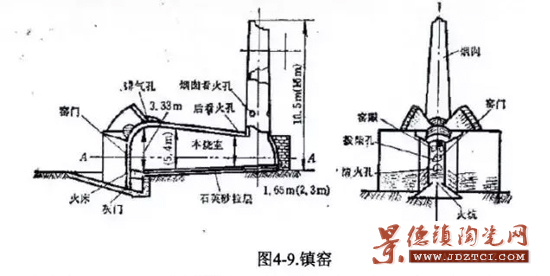 鎮(zhèn)窯的結(jié)構(gòu)是前部高而寬,后部低而窄緊接窯尾末端設(shè)有一與窯長相等的煙囪,窯身兩側(cè)用窯磚圍成一護窯墻,與窯身之間有0.2-0.3m的空隙。作為空氣隔熱層,以減少內(nèi)熱損失,并緩沖薄壁窯墻和窯頂脹縮而引起的開裂。蛋形窯有一個砌筑技術(shù)高超的薄壁煙囪,壁厚僅0.1-0.12m,上口截面在2米左右,煙囪斷面亦似蛋形,大頭方向指向窯前,囪壁前方垂直,后方向上收縮傾斜,頂部呈鋼筆尖形,尖端傾向窯頭。我國早在三百年前就能利用空隙隔熱層的方法砌磚,并能砌筑這樣高水平的煙囪,是窯爐史上了不起的的事情。明末清初,景德鎮(zhèn)能集我國歷代南北瓷器的大成,成就我國歷史上瓷器百花齊放的盛旺時代,是和這種窯分不開的。