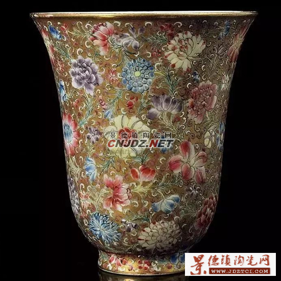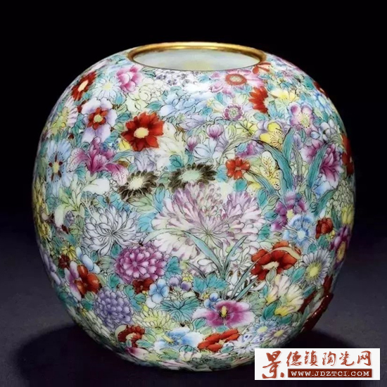 “百花不露”,也叫“百花不落地”,是瓷器釉上彩的一種表現手法。指的是將粉彩與金彩結合,各色花朵將整個畫面填滿,不露出瓷底,也不露出花朵的枝干。百花如同天女散花,浮于空中,故稱“百花不落地”。