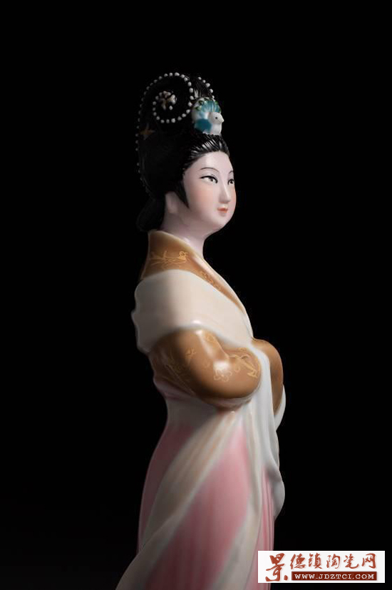 此件作品由曾在湖南省陶研所工作的羅景炘于二十世紀(jì)七十年代創(chuàng)作,造型上吸取了唐代宮廷仕女的特點(diǎn),選材上運(yùn)用了醴陵窯優(yōu)質(zhì)的大球泥配方,加上釉下五彩特有的高溫技法,使泥塑火燒后的這件《文成公主》作品顯得高貴、圣潔、栩栩如生。