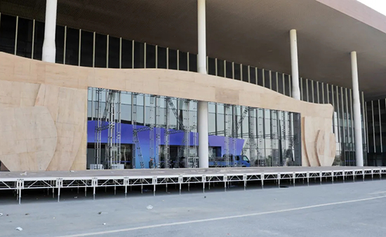 在景德鎮(zhèn)國(guó)際會(huì)展中心廣場(chǎng)上,首先映入記者眼簾的是B館前的開(kāi)幕式主席臺(tái),其主體框架已經(jīng)搭建完畢,展館內(nèi)許多展位都已經(jīng)初具雛形,材料切割聲偶爾傳來(lái)。記者看見(jiàn)主席臺(tái)的主色調(diào)是藍(lán)色為主調(diào),十分清新自然。B館一樓內(nèi),記者看到中間有不少瓷瓶造型的展位,充分體現(xiàn)了瓷博會(huì)瓷韻十足的裝飾特色,個(gè)別商家正在查看展位裝修細(xì)節(jié)。