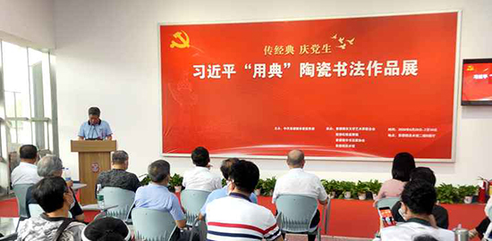 市文聯(lián)負責人在致辭中表示,這是一場思想和藝術(shù)完美結(jié)合的高層次展覽,是對習近平“用典”名句的藝術(shù)呈現(xiàn),傳遞了黨的聲音和社會的正能量,對于我們學習領(lǐng)會習近平新時代中國特色社會主義思想,增強文化自信和使命擔當,不斷推動社會主義文化繁榮興盛,具有十分重要的意義;這是一場書法與陶瓷深度融合的高層次展覽,不僅讓收藏在博物館里的文物、陳列在廣闊大地上的遺產(chǎn)、書寫在古籍里的文字都“活”了起來,更有力地宣傳、推廣和弘揚了陶瓷書法的無窮魅力,是在用陶瓷講好中國故事,傳遞著中國聲音。希望通過這場展覽,讓我們在學習習近平總書記用典中,進一步深入領(lǐng)會其中精神和思想精髓,從中汲取中華優(yōu)秀傳統(tǒng)文化豐富營養(yǎng),提升自身的素質(zhì);推動全社會對傳承傳統(tǒng)文化的關(guān)注,更好地傳承中華優(yōu)秀傳統(tǒng)文化,踐行社會主義核心價值觀,增強民族認同感和使命感;帶動廣大文藝家和文藝工作者們自覺地融入創(chuàng)作中,投身到景德鎮(zhèn)國家陶瓷文化傳承創(chuàng)新試驗區(qū)建設(shè)中,扛起肩負的使命和擔當。