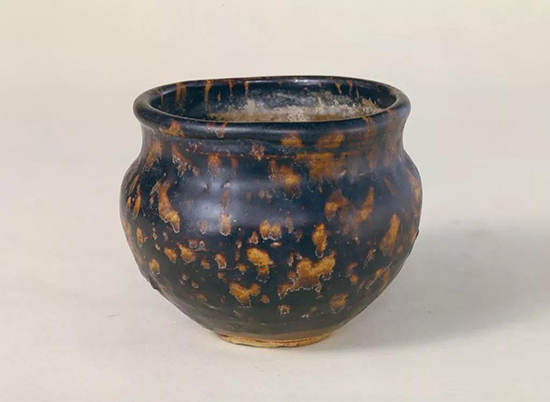 玳瑁釉是吉州窯瓷器上常見的一種窯變釉。在器物上先施一種氧化鐵含量較高的釉料,然后再隨意甩灑一種氧化鐵含量較低的釉料,燒成時(shí)產(chǎn)生交融、流淌,千變?nèi)f化,惹人喜愛。