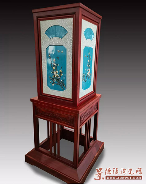 以雕刻工藝影青釉纏枝蓮綜合裝飾,內(nèi)空有扇形、長方菱形,有白色書法創(chuàng)作結(jié)合粉古彩、梅開五福多種構(gòu)圖形式由 24 朵梅花、18 朵梅花、14 朵梅花、44 朵梅花、總計一百朵梅花采用粉古彩創(chuàng)作。