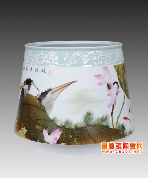 世上本無完美,所以在徐斌眼中,殘荷的美就是最真實的美。從事陶瓷藝術(shù)創(chuàng)作十余年,徐斌堅持用粉彩的藝術(shù)手法表現(xiàn)作品,同時,青花斗彩、高溫顏色釉斗彩、皇家釉斗彩、影青雕刻綜合裝飾等技法的運用也讓他的作品多元而又豐富。在采訪中,徐斌提到最多的一句話就是沒有創(chuàng)新就沒有出路,他認(rèn)為藝術(shù)創(chuàng)作道路需要不斷地創(chuàng)新才會越走越寬。正如他自己,盡管只有荷花這個主題,但是他從不復(fù)制作品,他認(rèn)為重復(fù)的藝術(shù)是沒有生命力的,這也正如他畫的荷花千姿百態(tài),或開得燦爛,或含苞待放,或挺拔直立,或函授捶腰,或與鱖魚嬉戲,總之,多樣荷花別樣姿態(tài)給觀者視覺上的多重享受。