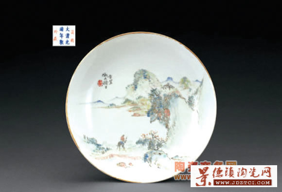 1855年,太平軍攻下江西,在景德鎮(zhèn)前后管轄達(dá)七年之久,這對(duì)景德鎮(zhèn)的制瓷業(yè)來說,是一個(gè)滅頂之災(zāi)。御窯被燒毀,庫存瓷樣和資料散失一空。避過殺身之禍的御窯廠畫師們,又面臨生計(jì)之困,除了燒制瓷器以外,他們一無所長(zhǎng),只能重操舊業(yè)。為降低成本,他們選擇放棄費(fèi)工費(fèi)料、燒造難度大的青花、粉彩,而選擇省工省料的淺絳彩,在日用粗瓷上畫幾筆淺絳彩,署上自己的名號(hào),低溫?zé)斐珊蠹纯纱齼r(jià)而沽。署名,也許對(duì)于他們而言,只不過是借御窯畫師名號(hào)促銷的手段,但這一做法卻使繪瓷人的身份和地位,在此以后發(fā)生了翻天覆地的變化。