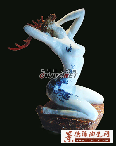 這種人神合一的形象給了趙坤巨大的震撼,她開始嘗試用簡練的雕塑語言表現(xiàn)這個動人的意象,雕塑的主體是少女美麗的裸體,而少女的頭則用各種動物的頭直接裝飾:美麗的鹿角、雄性的豹頭、閃著寒光的狼首。在裝飾手法上,趙坤也開始向傳統(tǒng)學習,大量運用了景德鎮(zhèn)原素,青花、粉彩繪出的圖案美侖美奐,表現(xiàn)出一種極具張力的美感。