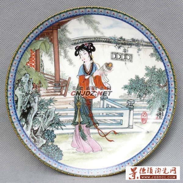 趙惠民根據(jù)古典文學(xué)名著《紅樓夢》設(shè)計(jì)創(chuàng)作的十二釵系列彩盤,個(gè)個(gè)性格鮮明,呼之欲出,十二個(gè)人物或立或坐、或讀書、或賞花。