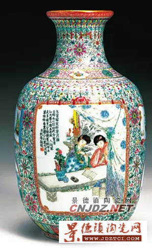 2007年 374萬(wàn)成交民國(guó) 粉彩開框人物瓶?钭R(shí):礬紅“乾隆御制”四字楷書款 說(shuō)明:撇口,模仿乾隆時(shí)期九江瓷的布局方法,周身繪菊花瓣,加以填色,筆觸之細(xì)致有過(guò)之而無(wú)不及。瓶身開框,繪仕女和花卉。工夫之深令人嘆為觀止。