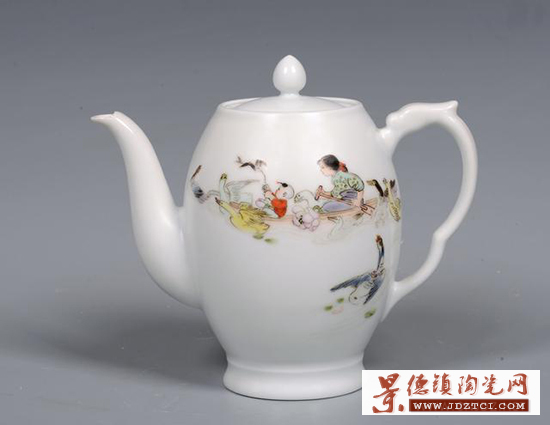 雖然是一把茶壺,一件日用瓷,卻當成藝術(shù)品在構(gòu)思、繪畫。畫面大面積留白,這些留白也成了構(gòu)圖的一部分,人和動物就在留白中游。