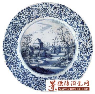 在美第奇試驗(yàn)失敗后數(shù)十載的時(shí)間里,似乎沒有人想再去仿制東方的陶瓷。但在1628年,一個(gè)名叫克里斯蒂安·威廉(Christian Wilhelm)的荷蘭陶工開始在薩瑟克(Southwark)制作容器。他用的是藍(lán)白兩色,主題則是多少有些生硬地從明代瓷器上照搬下來的。1637年,漢堡的一個(gè)陶器場也在制作類似的青花陶碟。我們對這兩個(gè)制陶場的情況幾無所知。它們似乎都是在1660年之前就破產(chǎn)了,當(dāng)時(shí),兩個(gè)更加有名的制陶場所已經(jīng)在生產(chǎn)藍(lán)白相間、質(zhì)量高得多的器皿。一個(gè)是荷蘭代夫特(Delft)的那批陶器廠。在通俗的說法中,歐洲所有的這類容器都被冠以代夫特之名。另一個(gè)則是法國納韋爾(Nevers)的陶器廠。代夫特的那批陶器廠始于何時(shí),現(xiàn)在仍不確定,但已知的少量事實(shí)還是可以簡要概括如下。1614年,某個(gè)名叫克拉斯·揚(yáng)松·維特曼斯(Claes Janszoon Wijtmans)的家伙從邦聯(lián)議會(huì)那里獲得許可,成立了一個(gè)彩陶廠,生產(chǎn)像“印度地域”的那種陶器。在該地點(diǎn)的挖掘,也僅僅出土了意大利產(chǎn)的錫釉陶器類型的陶瓷碎片,裝飾的則是純粹的歐洲圖案,有石榴、橙子、鳥、獸和花。直到17世紀(jì)中期,陶器場才以著名的藍(lán)青花陶器迎來了它的輝煌時(shí)期。起初,這些陶器中的大部分都是仿自當(dāng)時(shí)由荷蘭人進(jìn)口到歐洲的中國和日本的陶瓷容器。在接下來的150年里,代夫特制造廠生產(chǎn)了一大批仿制的(還不包括假冒的)中國容器。其中一些如此接近原型,以至于一眼看上去都不太會(huì)看出它們是出自歐洲。
