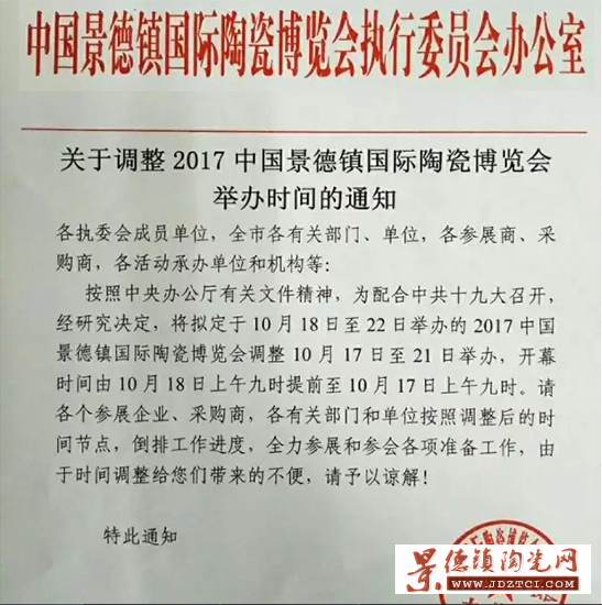 9月20日記者從瓷博會執(zhí)委辦獲悉,為配合中共十九大召開,將擬定于10月18至22日舉辦的2017中國景德鎮(zhèn)國際陶瓷博覽會調(diào)整為10月17日至21日舉辦,開幕時間由10月18日上午九時提前至10月17日上午九時。